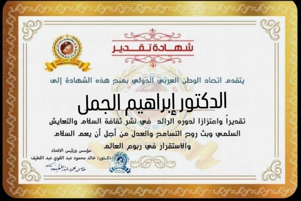 مؤسس ورئيس اتحاد الوطن العربي الدولي يمنح شهادة تقدير للدكتور إبراهيم الجمل مدير عام منطقة وعظ الإسكندرية ورئيس لجنة الفتوى بالإسكندرية بجمهورية مصر العربيةitihadworld26/02/2026تكريمات
