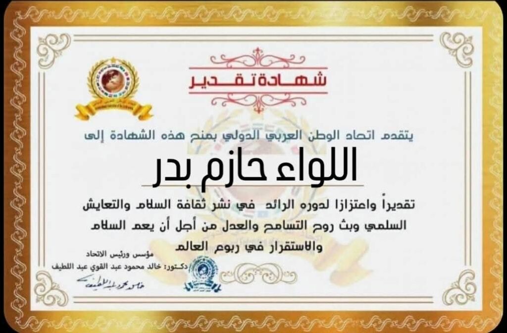 مؤسس ورئيس اتحاد الوطن العربي الدولي يمنح شهادة تقدير للواء حازم بدر قائد المنطقة الشمالية العسكرية بجمهورية مصر العربيةitihadworld26/02/2026تكريمات