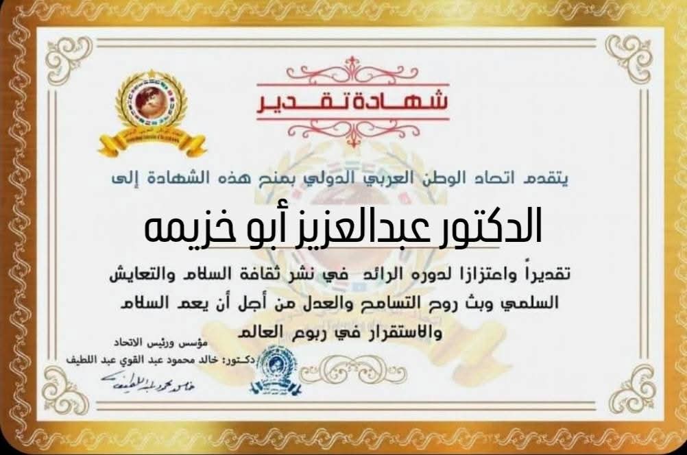 مؤسس ورئيس اتحاد الوطن العربي الدولي يمنح شهادة تقدير للدكتور عبدالعزيز أبو خزيمه رئيس الإدارة المركزية للمنطقة الأزهرية بمحافظة الإسكندرية بجمهورية مصر العربيةitihadworld26/02/2026تكريمات