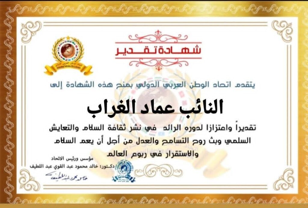 مؤسس ورئيس اتحاد الوطن العربي الدولي يمنح شهادة تقديرللنائب عماد عبدالسلام إبراهيم الغراب عضو مجلس النواب عن محافظة المنوفية الدائرة الثالثةitihadworld26/12/2025تكريمات