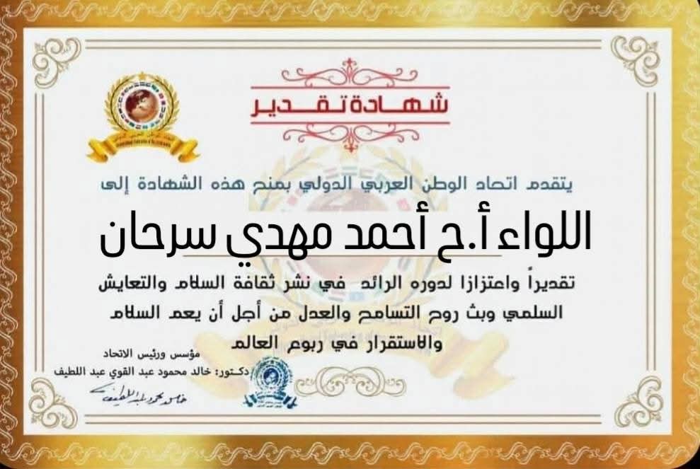 مؤسس ورئيس اتحاد الوطن العربي الدولي يمنح شهادة تقدير للواء أركان حرب أحمد مهدي سرحان قائد الجيش الثالث الميداني بجمهورية مصر العربيةitihadworld26/02/2026تكريمات