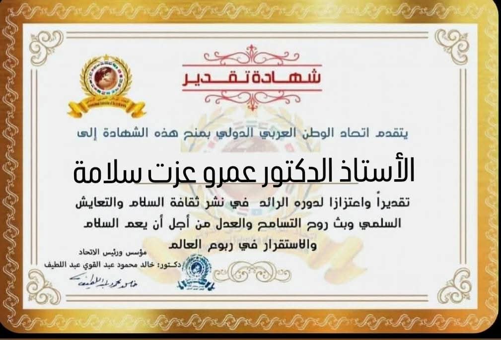 مؤسس ورئيس اتحاد الوطن العربي الدولي يمنح شهادة تقدير للأستاذ الدكتور عمرو عزت سلامة الأمين العام لاتحاد الجامعات العربيةitihadworld27/02/2026تكريمات