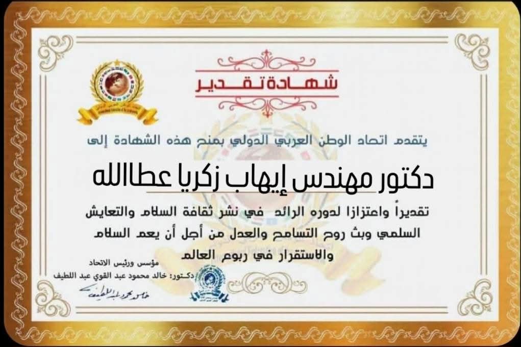 مؤسس ورئيس اتحاد الوطن العربي الدولي يمنح شهادة تقدير للدكتور مهندس إيهاب زكريا عطاالله عضو مجلس الشيوخ الأمين المساعد لجنة الاسطان المركزية بحزب الجبهة الوطنيةitihadworld28/02/2026تكريمات