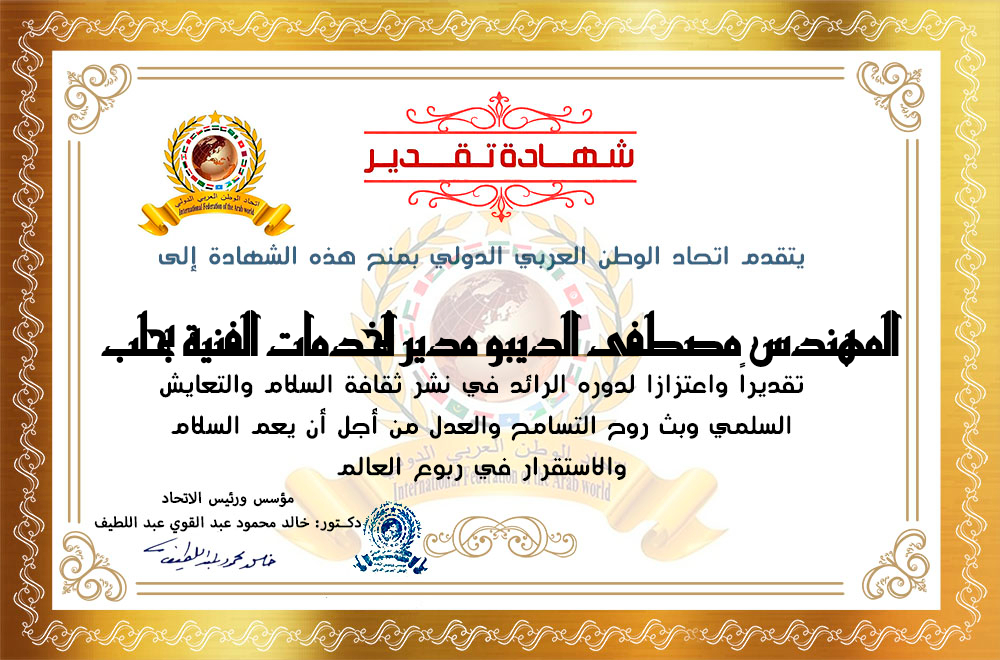 مؤسس ورئيس اتحاد الوطن العربي الدولي الدكتور خالد محمود عبد القوي عبد اللطيف يمنح شهادة تقدير للمهندس مصطفى الديبو مدير الخدمات الفنية بمحافظة حلبitihadworld01/03/2026تكريمات