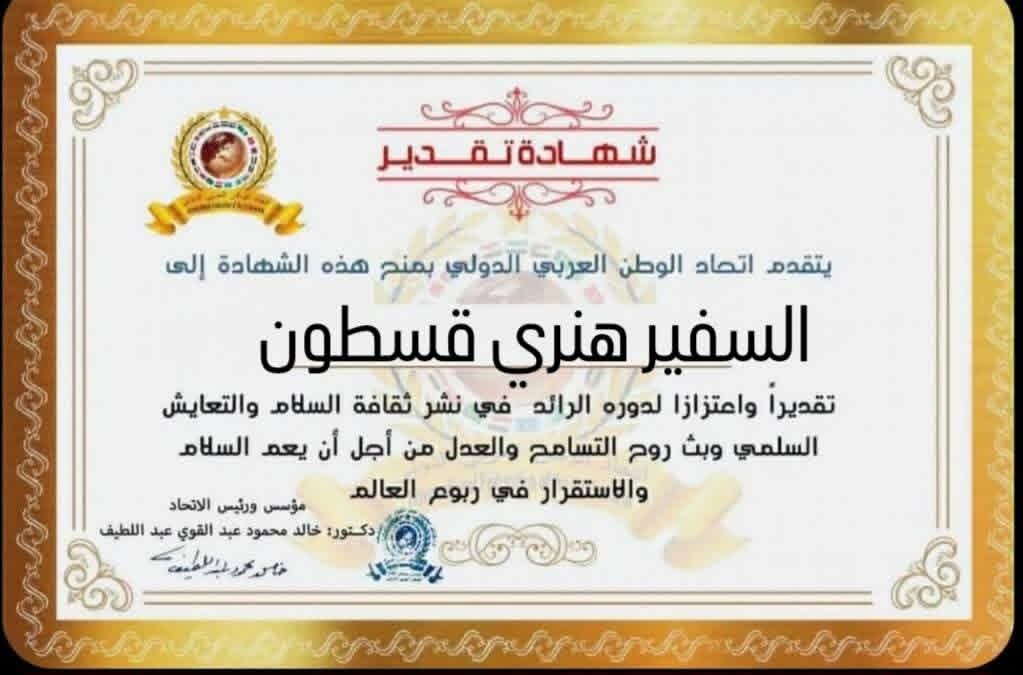 مؤسس ورئيس اتحاد الوطن العربي الدولي يمنح شهادة تقدير للسفير هنري قسطون سفير جمهورية لبنان في سورياitihadworld05/03/2026تكريمات