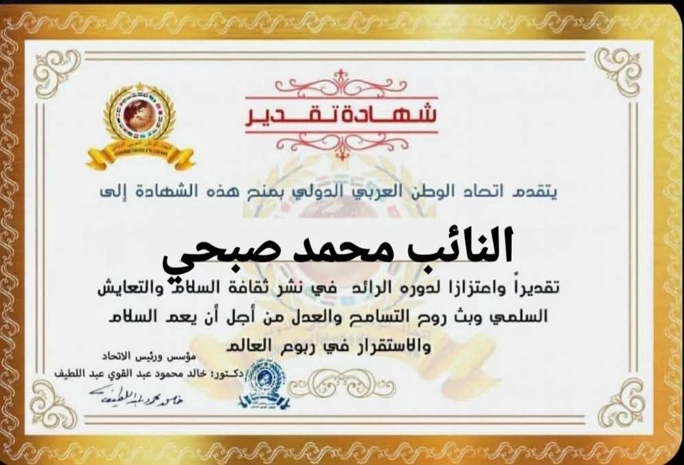 مؤسس ورئيس اتحاد الوطن العربي الدولي يمنح شهادة تقدير للنائب محمد صبحي عبد القوي الخولي عضو مجلس النواب عن محافظة المنوفية الدائرة السادسة