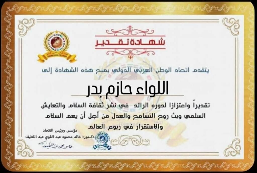 مؤسس ورئيس اتحاد الوطن العربي الدولي يمنح شهادة تقدير للواء حازم بدر مساعد قائد المنطقة الشمالية بجمهورية مصر العربية
